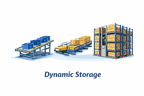We can divide dynamic storage systems into subtypes that improve picking efficiency: carton flow racking, pallet shuttle racking, and mobile racking systems. These systems often use gravity or semi-automation to move inventory.