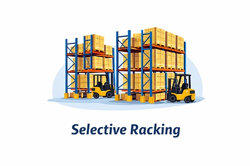 Standard Selective Pallet Racking: Adjustable beams store pallets one-deep, offering full accessibility and compatibility with standard forklifts.
